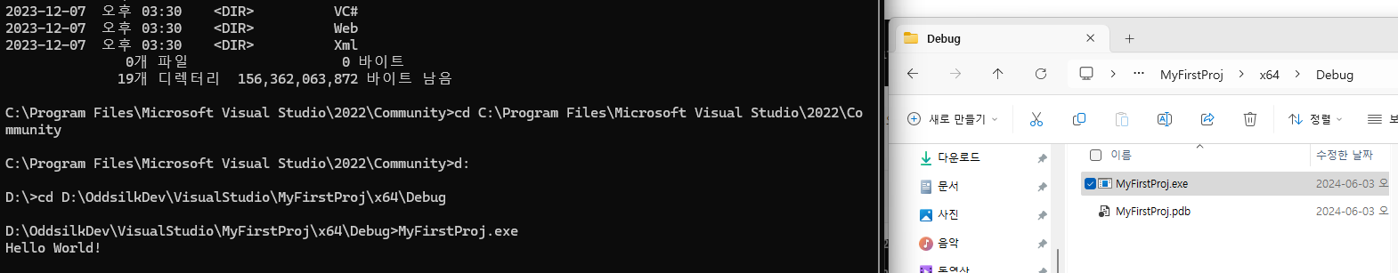 Hello world를 출력하도록 작성하고 실행파일을 만든 위치로 경로를 이동해서 exe파일을 실행하면 이렇게 콘솔창에 HelloWorld가 출력된 것을 확인할 수 있다
