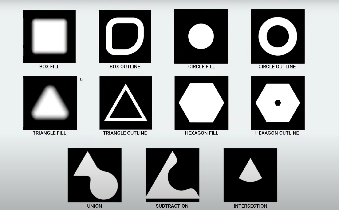 이것은 우리가 만든 SDF의 개요입니다. 머티리얼 랩에 추가한 것입니다. 그래서 우리는 상자, 삼각형, 원, 육각형을 가지고 있습니다.