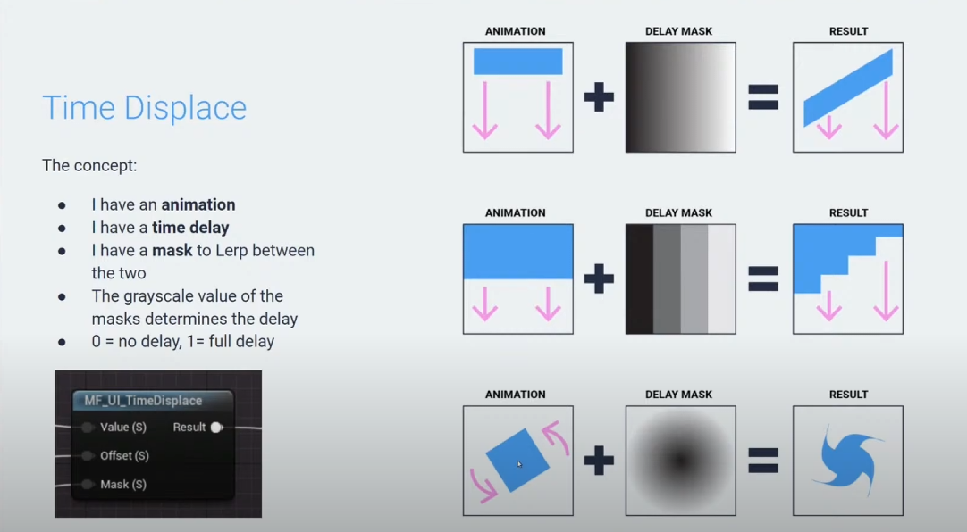 I find myself having to loop time. So I will take the game time and I will multiply it by a speed parameter, and then I use the Frac node, or I have to do some basic transforms,
