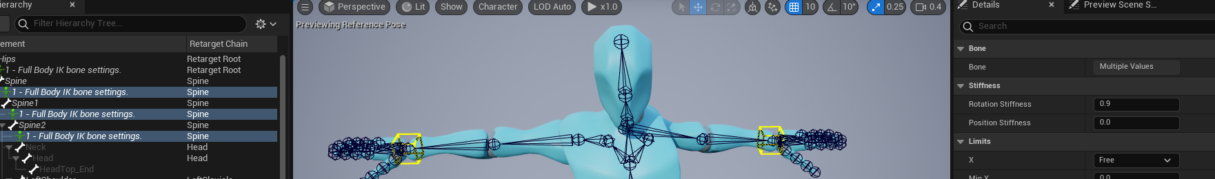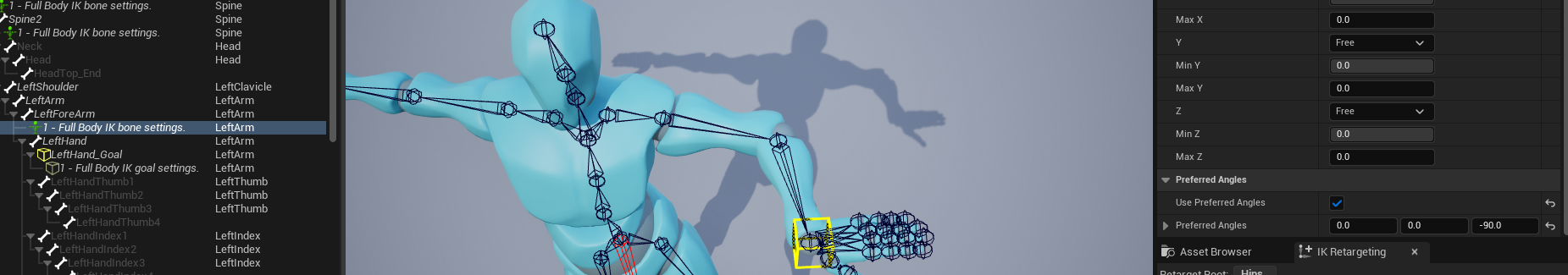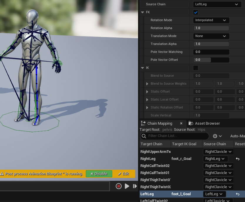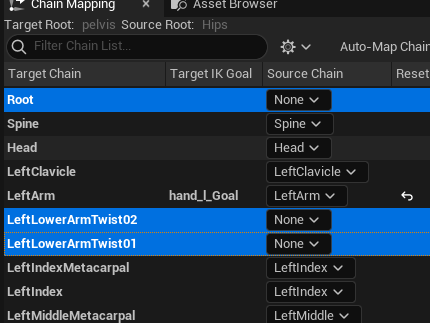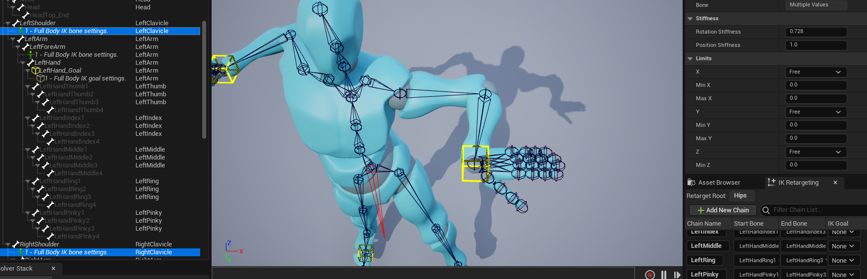 IK 설정을 해준 것이 여기서는 부딛히게 되는 것이기 때문에 이번에는 IK를 빼고 FK를 적용해보도록 하자. 오른쪽 하단 ChainMapping에서 모든 IK Goal들을 선택하고 Detail에서 IK 체크박스를 해제해 주면된다