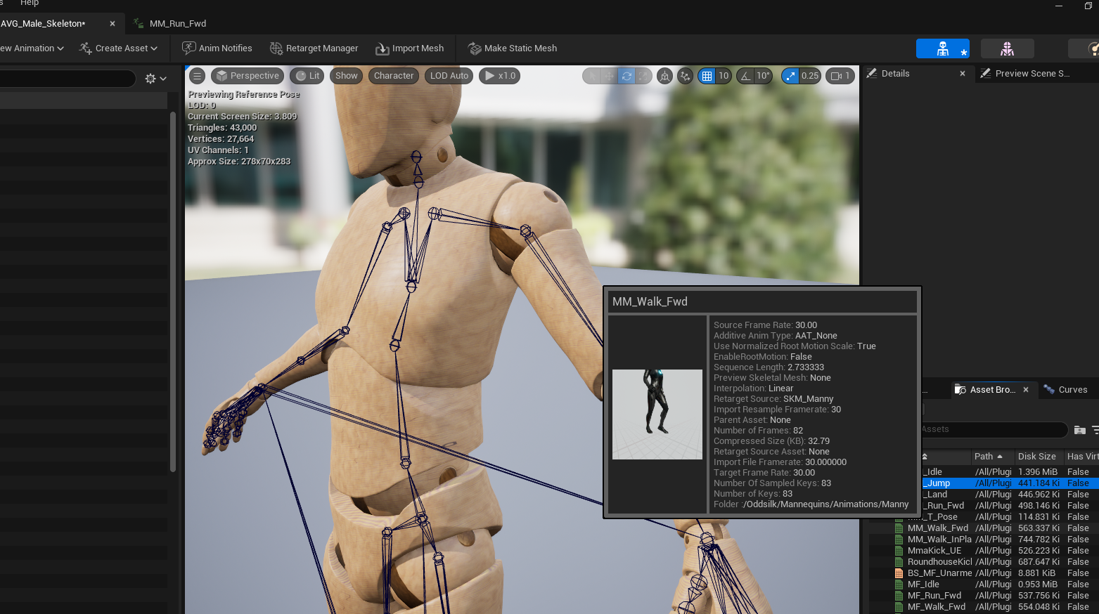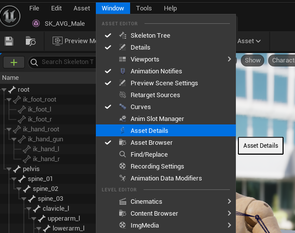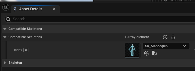 - 공유를 하고싶은 스켈레톤 파일에서 AssetDetails를 열어준다. 이번에는 Mannequin의 애니메이션을 WoodMannequine에서 사용하고 싶기 때문에, WoodMannequin의 창을 열고 실행한다.