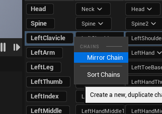 왼쪽 위 그림처럼 좌우 중에 한쪽만 선택을 하고Chain을 만들고 나면 Mirror 기능을 이용해서 반대쪽도 만들어줄 수 있다.
