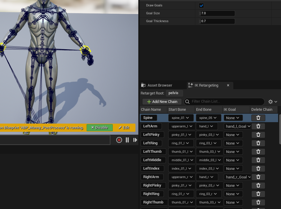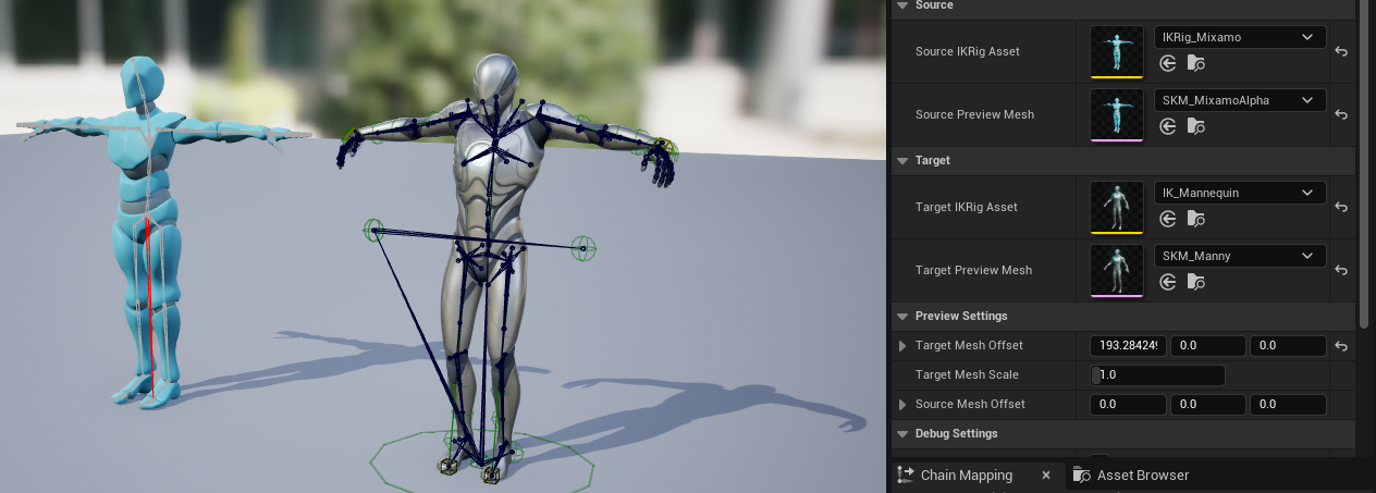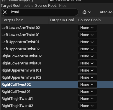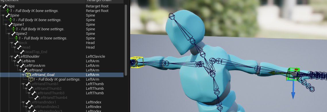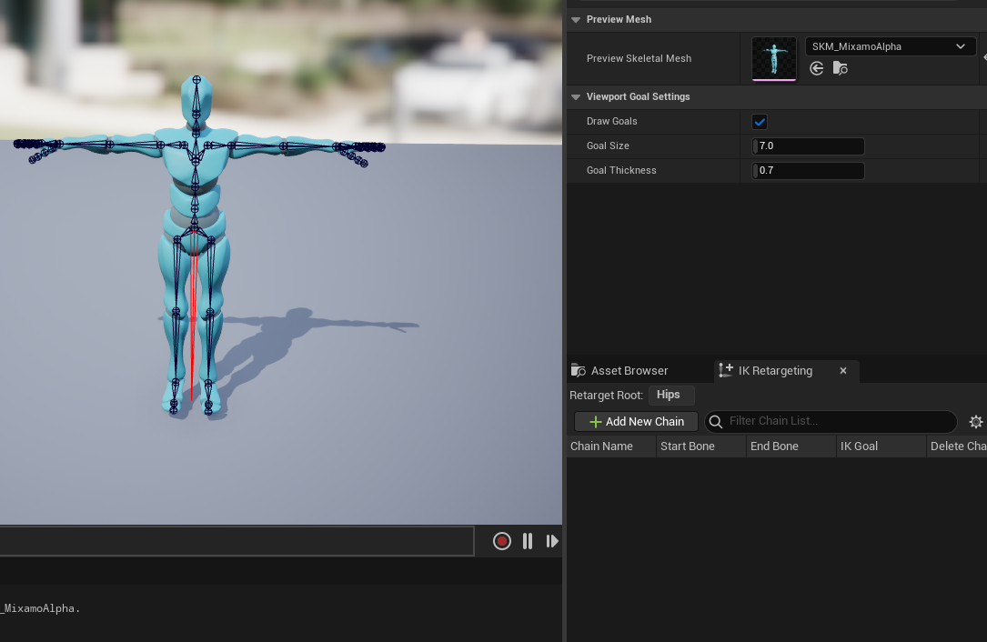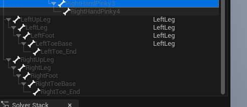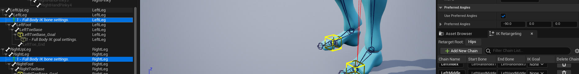 그러면 왼쪽의 Rig정보에 RetargetChain에 이름이 붙여진 것을 볼 수 있고 오른쪽에 IK Retargeging에서도 같은 이름으로 시작Bone과 끝Bone이 설정된 것을 알 수 있다.