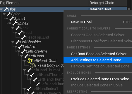 이제 다른 Bone을 선택하고 우클릭 AddNewRetargetChain을 눌러 이름을 설정하고 적용해준다.