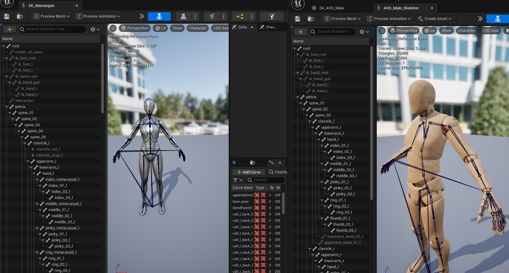 - 왼쪽은 언리얼 엔진에서 기본으로 제공해주는 스켈레탈 메쉬인 Mannequin의 스켈레톤이고, 오른쪽은 개인적으로 마켓플레이스에서 구매했던 스켈레탈 메쉬의 스켈레톤파일이다. 임시로 WoodMannequin이라고 부르겠다.