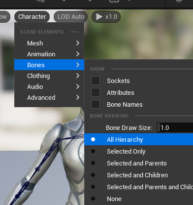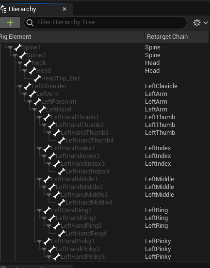 스켈레톤 에셋으로가 서 All Hierachy를 켜주면, 뼈대를 구성하는 모든 Bone을 볼 수 있게 된다.