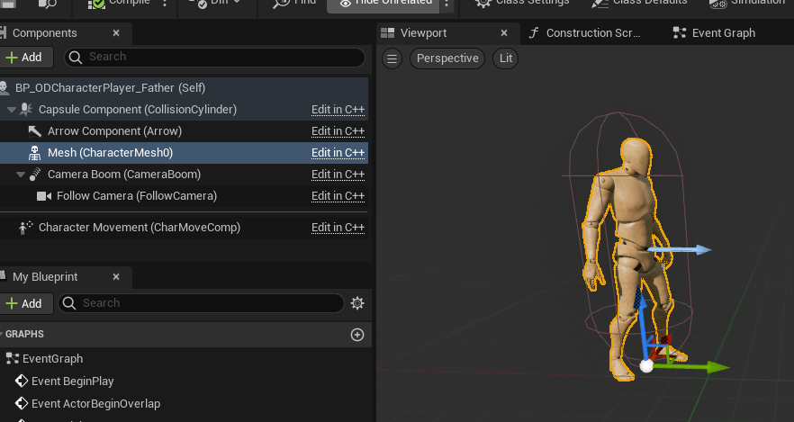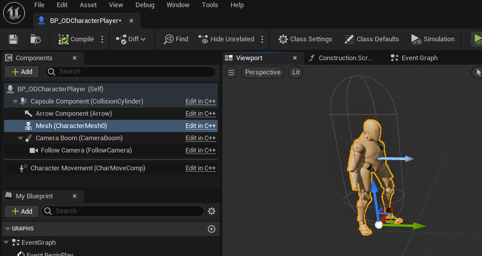- 게임에서 활용할 블루프린트 캐릭터의 메쉬를 스켈레톤으로 바꿔보았다. 애니메이션이 적용되긴 한것 같지만 일그러진 것 같은 모습이 보인다.