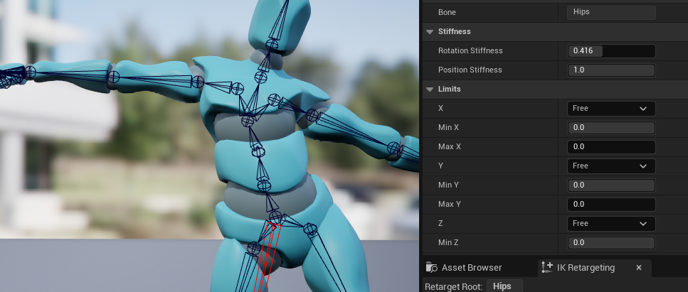 꺾인 허리를 Position과 Rotation의 Stiffness를 이용해서 조절해준다.