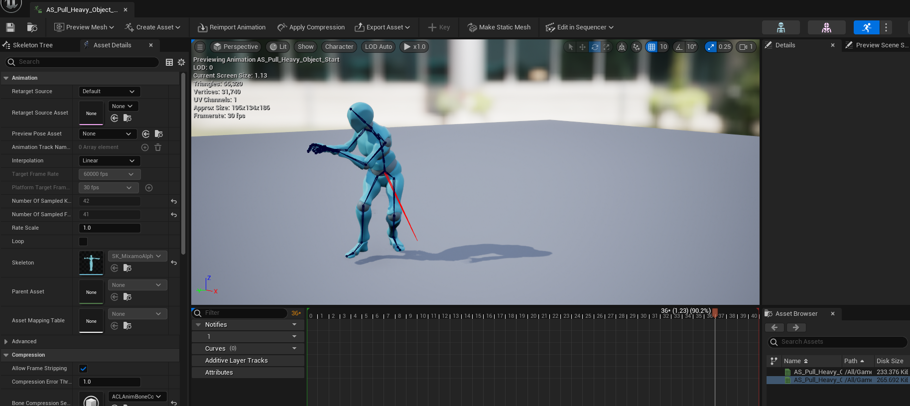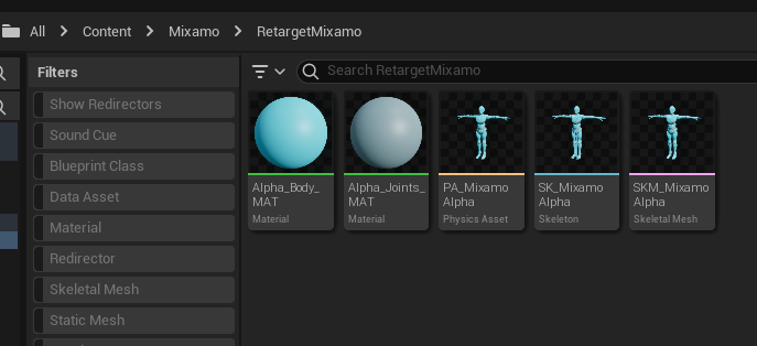 이렇게 애니메이션 데이터와 스켈레탈 메쉬, 스켈레톤 에셋들이 함께 들어온 것을 확인할 수 있다.