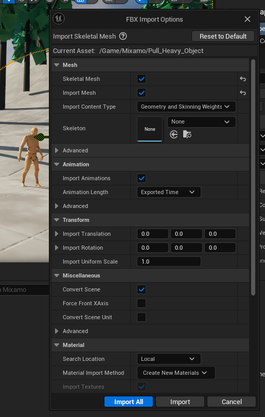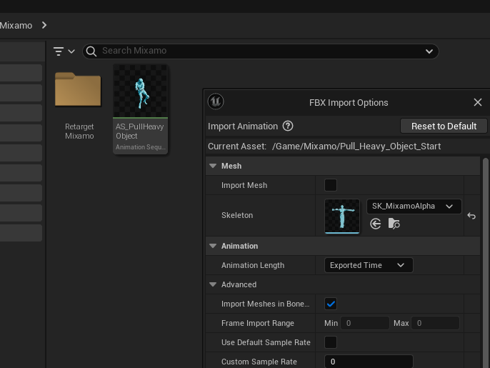다운로으한 애니메이션 데이터중 하나만 클릭하고 엔진에 드래그엔 드롭으로 import한다, importAnimation옵션이 꺼져있는 경우 true로 체크해준다.