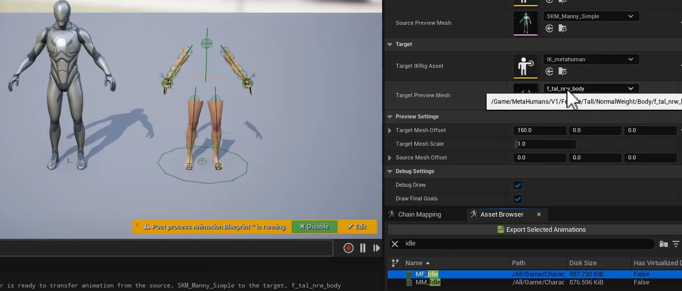이것도 IKRig를 활용한 리타게팅 방식이다. 에니메이션 블루프린트를 활용한 방식인데 AnimationBlueprint에서 지정을 해주면, 실시간으로 Retargeting한다. 즉, 스켈레턴구조가 다르더라도 게임 플레이에서 같은 모션으로 동작하도록 지정을 해줄 수가 있다는 이야기이다.